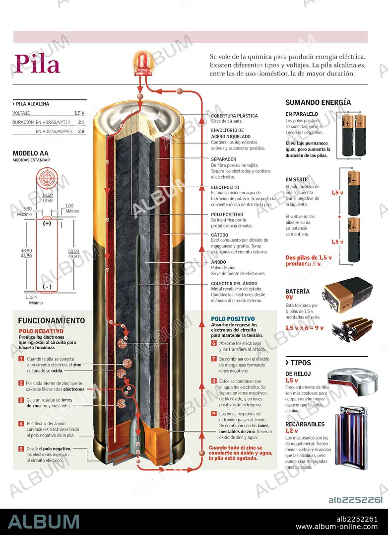 Infografía de las partes y el funcionamiento de una pila alcalina.