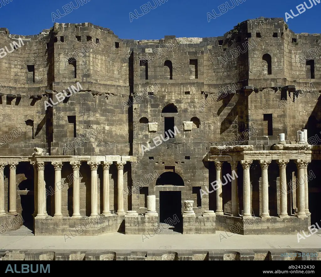 ARTE ROMANO. PROXIMO ORIENTE. SIRIA. TEATRO ROMANO DE BOSRA. Construido a finales del siglo II d. C., en el periodo tardo romano. Vista general de la fachada del ESCENARIO (SCENARIUM), decorado con columnas de mármol. BOSRA.