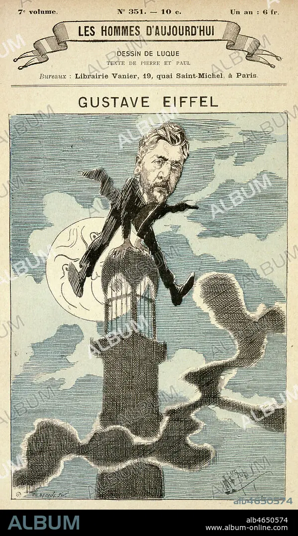 Caricature de Gustave EIFFEL (1832-1923) jouant a saute-mouton au sommet de sa tour, par Manuel LUQUE (1854-1924) publiee dans Les Hommes d'Aujourd'hui a la fin du 19eme s. Credit : Collection KHARBINE-TAPABOR.