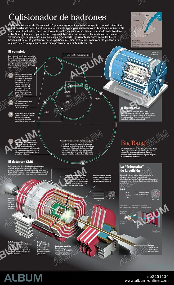 Descripción: Infografía del funcionamiento del LHC, el gran colisionador de hadrones, construido para estudiar el origen del universo mediante la observación del comportamiento de la materia.
