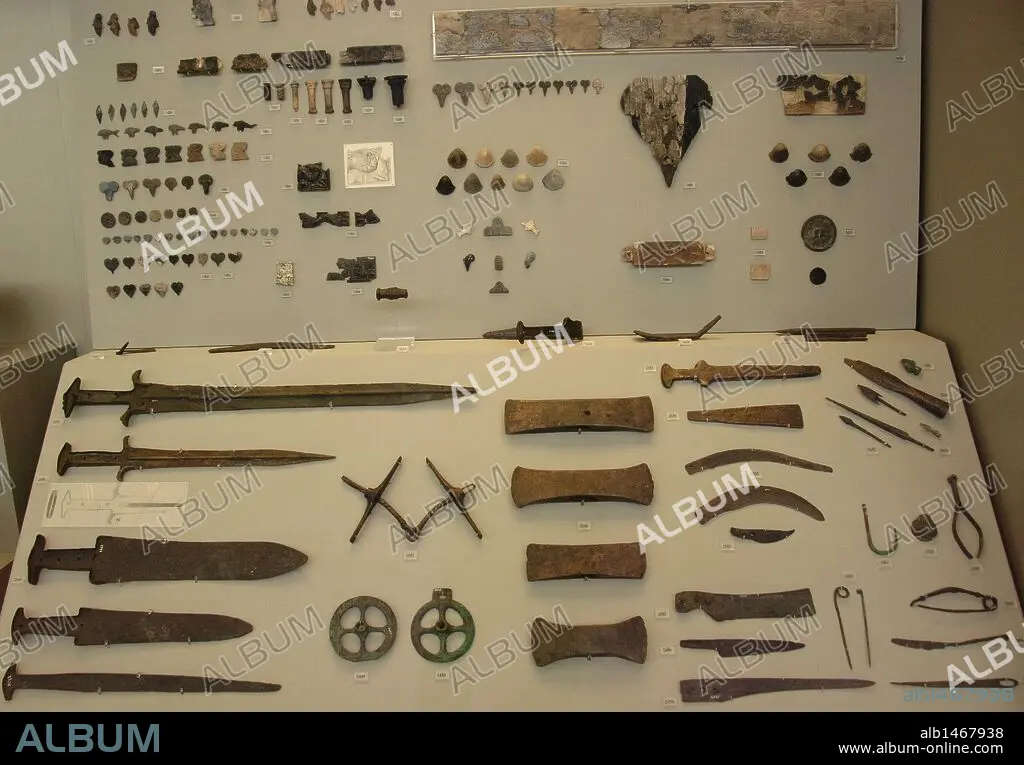 Descripción: ARTE PREHISTORICO. EDAD DE LOS METALES. GRECIA. Muestra de diferentes tipos de puñales, hachas, cuchillos y utensilios diversos. Museo Arqueologico Nacional. Atenas. Grecia.