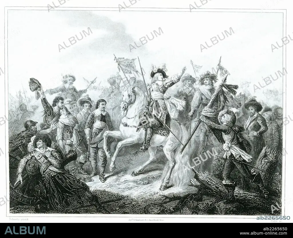 Francia. Batalla de Rocroy. Derrota de los tercios españoles de Flandes por las tropas francesas mandadas por el duque de Enghien (Grand Condé), el 19 de marzo de 1643. Grabado de 1853.