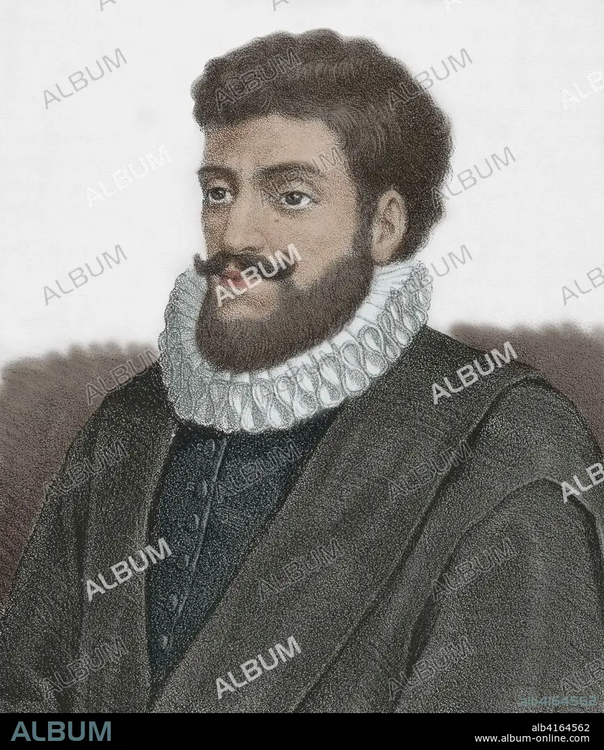 Francisco Sánchez el Escéptico (1551-1623). Filósofo escéptico y médico renacentista. Dibujo por Llanta. Detalle. Litografía. Coloreada. Retrato. Crónica General de España, Historia Ilustrada y Descriptiva de sus Provincias. Extremadura, 1870.