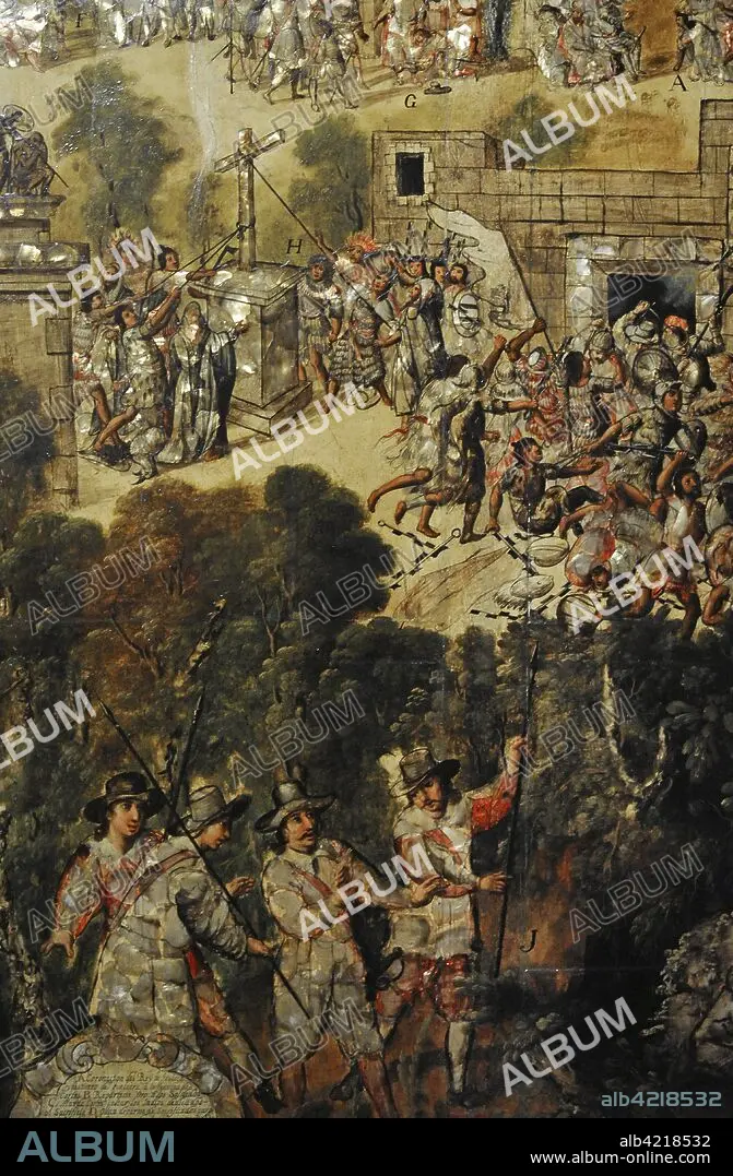 Descripción: Título: Conquista de México. Autor: Anónimo. Tabla. Pintura al óleo, nácar. Enconchado. Forma parte de un conjunto de 6 tablas. Escenas de enfrentamientos entre conquistadores españoles y nativos, y escena del hallazgo del tesoro por parte de"cuatro españoles". 1676-1700. Detalle. Escuela Mexicana. Virreinato de Nueva España. México. América del Norte. Museo de América. Madrid. España.