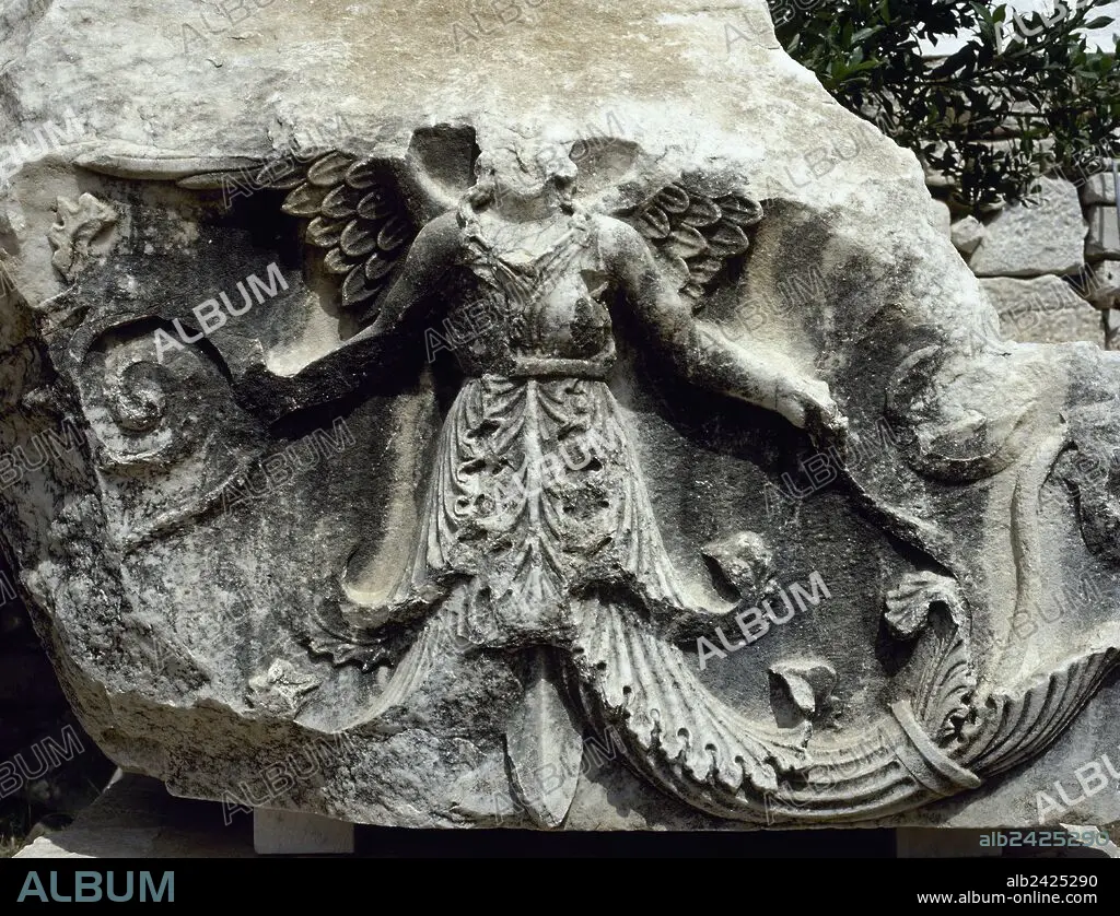 ARTE GRIEGO-HELENISTICO. TURQUIA. SANTUARIO DE APOLO. Famoso en la antigua Grecia por sus oráculos. Los vestigios más antiguos se remontan al siglo VIII a. C. Alejandro Magno realizó su última ampliación tras la conquista de Asia Menor. Detalle de los relieves que decoraban el ARQUITRABE del PRONAOS con la representación de un GENIO ALADO. DIDYMA. Península Anatólica.