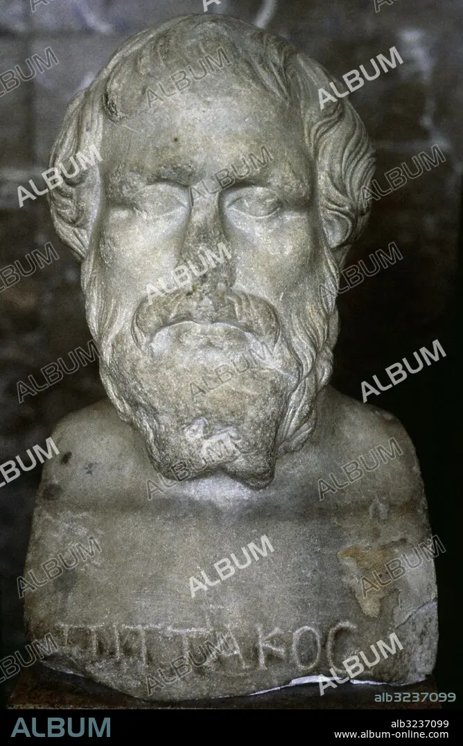 Pítaco de Mitilene (Mitilene,640-568 a. C.). Fue uno de los Siete Sabios de Grecia. Legislador de Mitilene. Contribuyó a poner fin a la tiranía de Melancro. Más tarde gobernó la polis durante diez años y llevó a cabo su obra legislativa. Busto. Copia romana de un original griego de la segunda mitad del siglo IV a. C. Museo del Louvre. París. Francia.