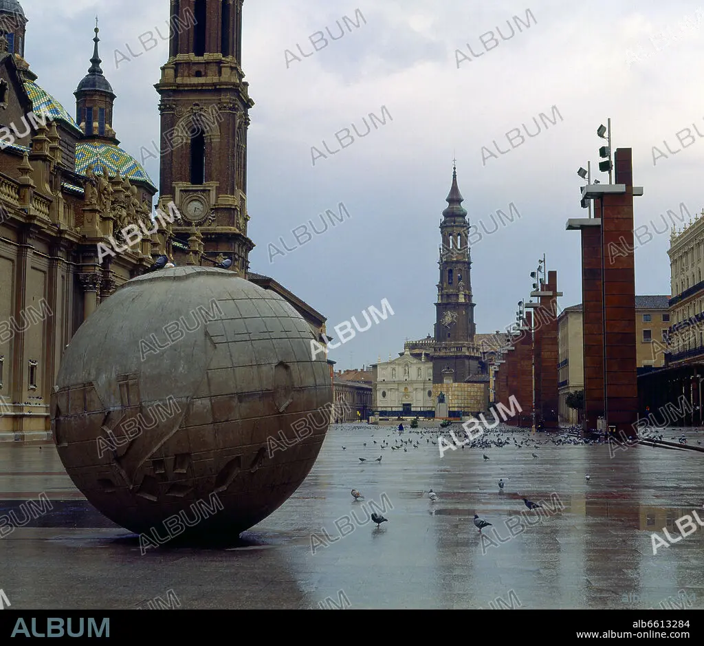 Descripción: BOLA DEL MUNDO (1991) EN LA PLAZA NUEVA DEL PILAR CON LA CATEDRAL DEL SALVADOR AL FONDO - FOTO AÑOS 90
