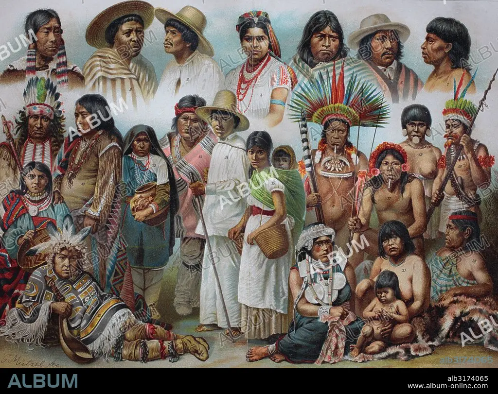 Ethnic groups of america: 1 labrador inuit woman, 2 mexican, 3 highland mexican, 4 yucatan mexican, 5 indians from ecuador, 6 indians from peru, 7 ipurina, 8 sioux, 9 +10. apaches, 11 bellacoola, 12 +13. pueblo indians, 14 +15. zapoteca, 16 bororo, 17 caraja, 18 botokudin, 19 omagua from brazil, 20 araucanian from chile, 21 +22. fuegians, 23 patagonian, historical illustration, wood engraving, circa 1888
