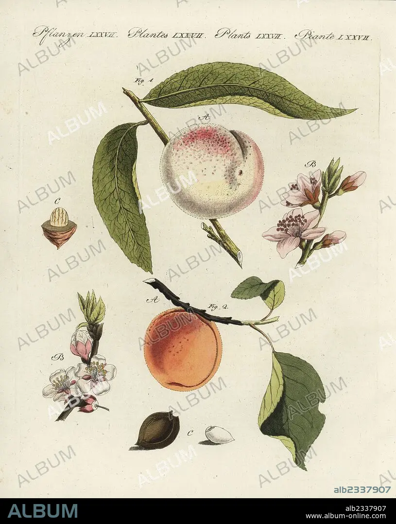Peach tree, Prunus persica 1, and apricot, Prunus armeniaca 2, with fruit, blossom, leaf and stone. Handcoloured copperplate engraving from Friedrich Johann Bertuch's Bilderbuch fur Kinder (Picture Book for Children), Weimar, 1798.