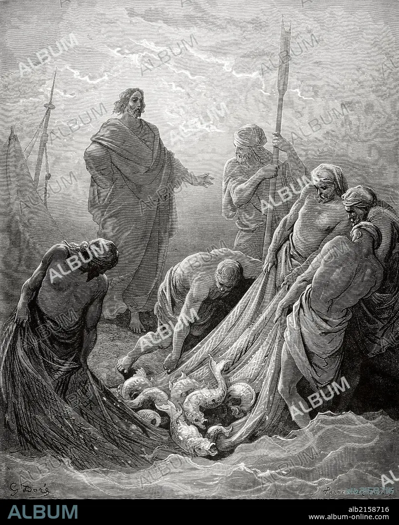 NUEVO TESTAMENTO. Jesús. "Pesca Milagrosa". Dibujo de G. Doré. Grabado de Pannemaker. Evangelio de San Lucas. Cap V. Versículo 4 al 10.