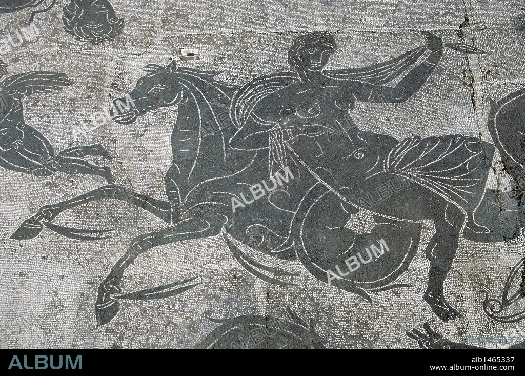 ARTE ROMANO. ITALIA. OSTIA ANTICA. Ciudad romana en la costa del Mar Tirreno, en el antiguo Latium. Puerto comercial de la antigua Roma. TERMAS DE NEPTUNO (siglos I y II). Detalle del MOSAICO "TRIUNFO DE NEPTUNO". Cercanías de Roma. Lazio.