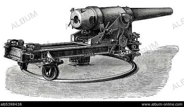 Illustration, cannon, German marine turret cannon with an upper deck mount and a central pivot, 19th Century, Meyers Konversations-Lexikon encyclopaedia, 1889.