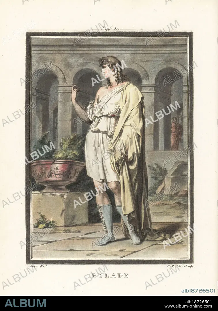 Pylades, friend of Orestes, character in Jean Racine's tragedy Andromache (Andromaque). Young man in curls, pallium mantle, short tunic, laced boots, standing before a flowerpot in a courtyard. Pylade. Hand-coloured copperplate engraving by Pierre-Michel Alix after an illustration by Philippe Chéry from Jean-Charles Le Vacher de Charnois's Recherches sur les Costumes et sur les Theatres de Toutes les Nations, M. Drouhin, Paris, 1790.