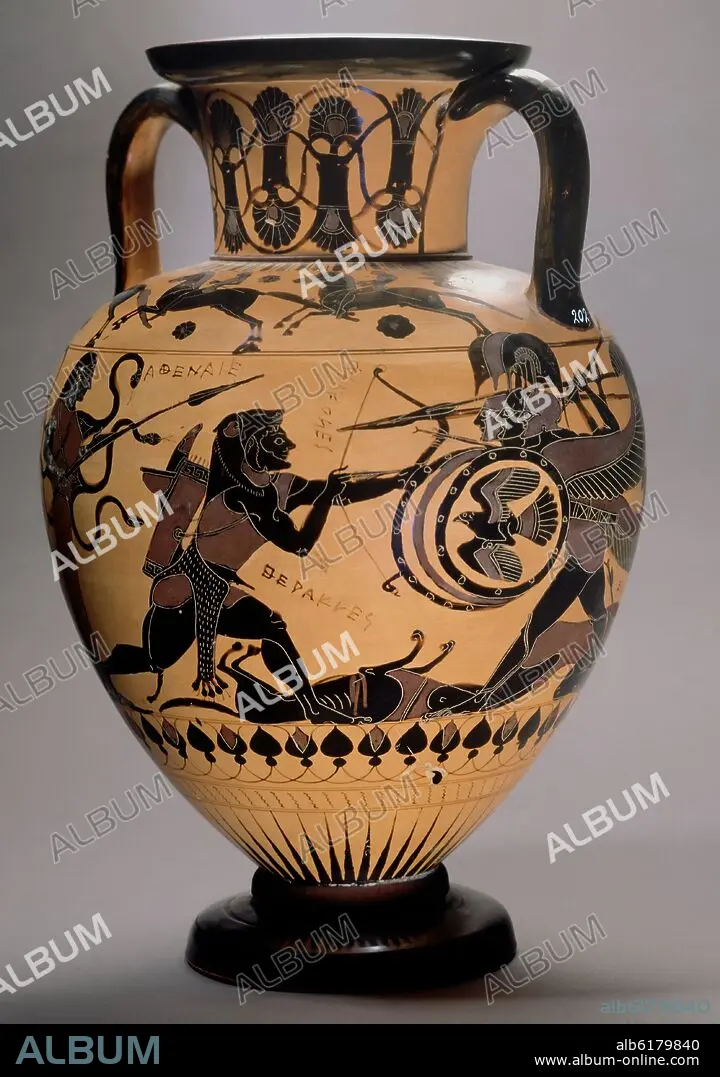 ANFORA GRIEGA DECORADA CON UNA ESCENA DE LOS COMBATES ENTRE HERCULES Y GERION - SIGLO VI AC
