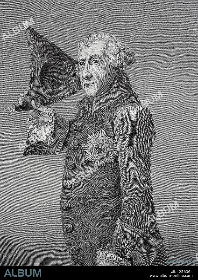 Portrait of Frederick II or Frederick the Great, popularly also the Old Fritz, 24 January 1712, 17 August 1786, King of Prussia, woodcut, Germany, Europe.