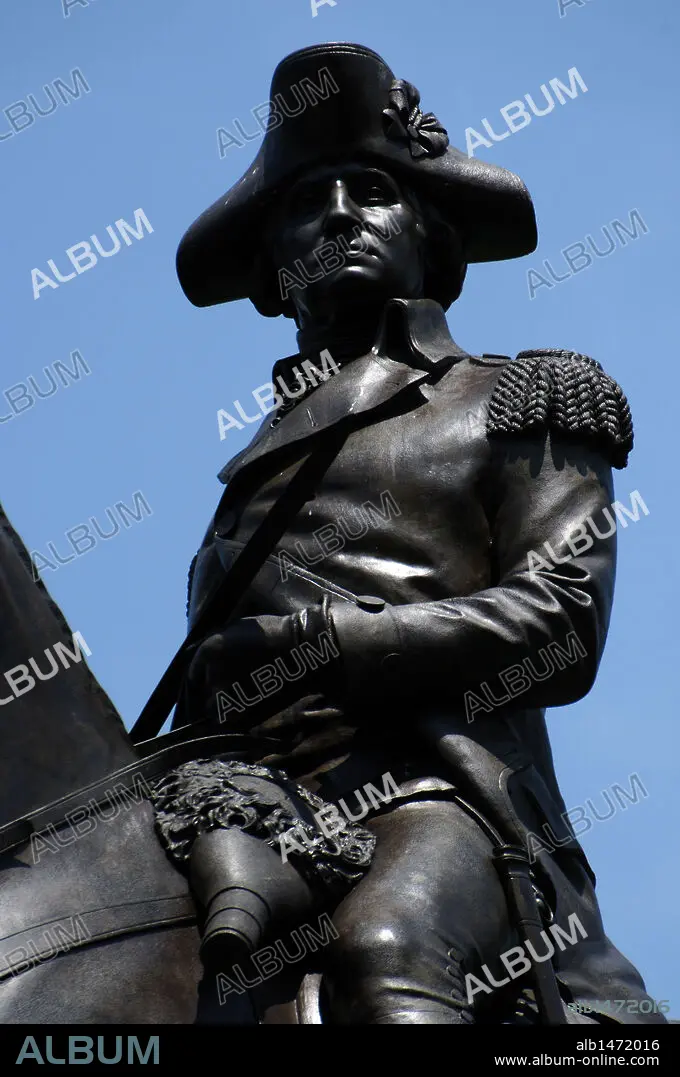 GEORGE WASHINGTON (1732-1799). Militar y político estadounidense. Ganó la guerra de la Independencia contra Inglaterra (1775-1782). Elegido para la presidencia de la Convención de 1787, firmó la Constitución de los Estados Unidos. Elegido presidente en 1789 y 1792. S. XVIII. Detalle. Monumento en el Parque Boston Common. Boston. Estado de Massachusetts. Estados Unidos.