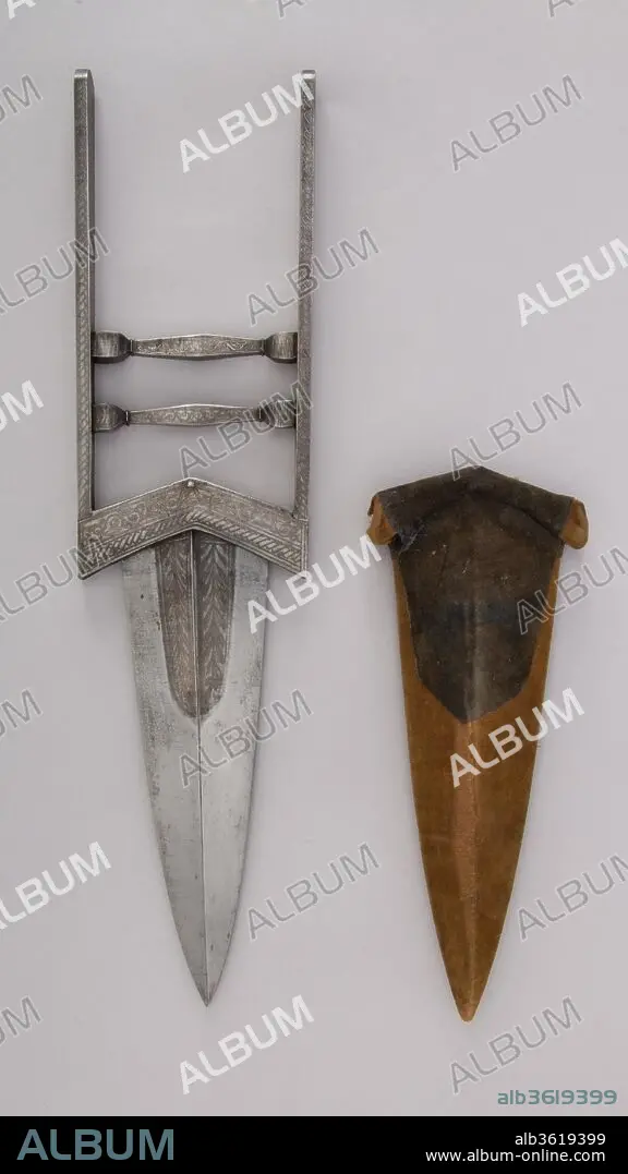Dagger (Katar) with Sheath. Culture: Indian. Dimensions: L. with sheath 16 7/8 in. (42.9 cm); L. without sheath 15 3/4 in. (40 cm); L. of blade 8 1/16 in. (20.5 cm); W. 4 in. (10.2 cm); D. 3/4 in. (1.9 cm); Wt. 1 lb. 11.7 oz. (785.3 g); Wt. of sheath 1.1 oz (31.2 g). Date: 19th century.