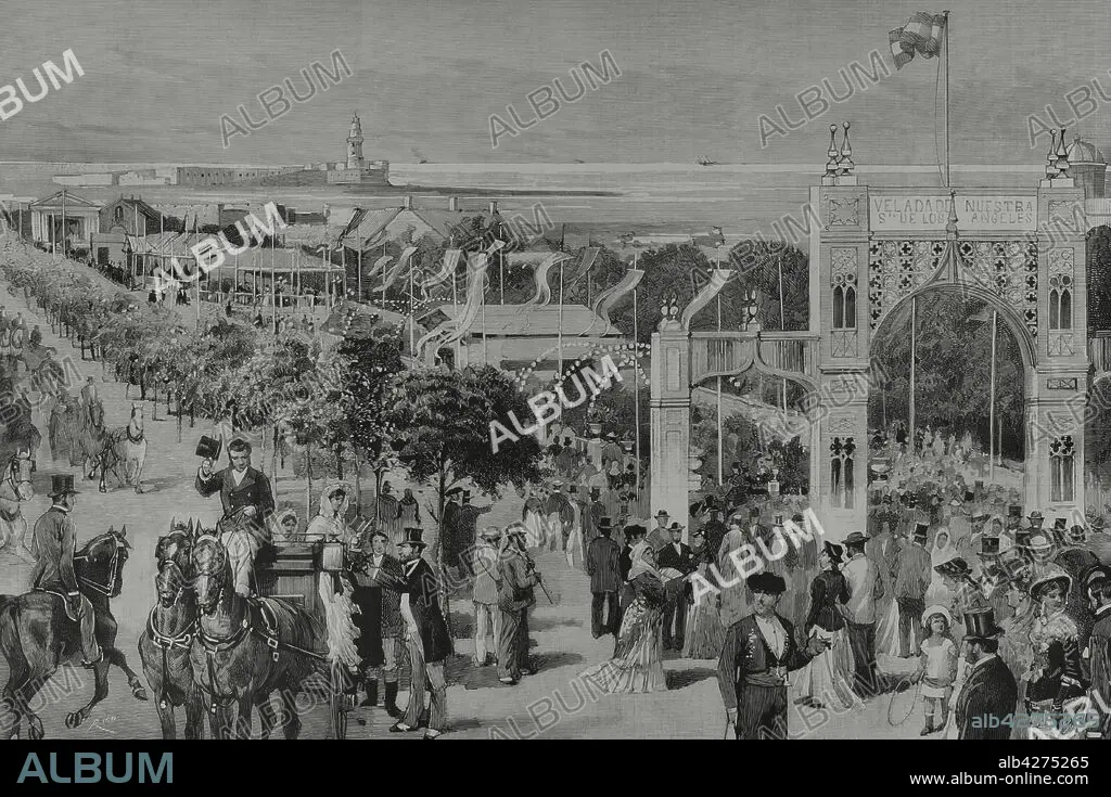Descripción: España. Andalucía. Cádiz. El Paseo de Las Delicias, durante la festividad "La Velada de Nuestra Señora de los Angeles", celebrada la primera quincena de agosto. Grabado por Bernardo Rico. La Ilustración Española y Americana, 15 de agosto de 1882.