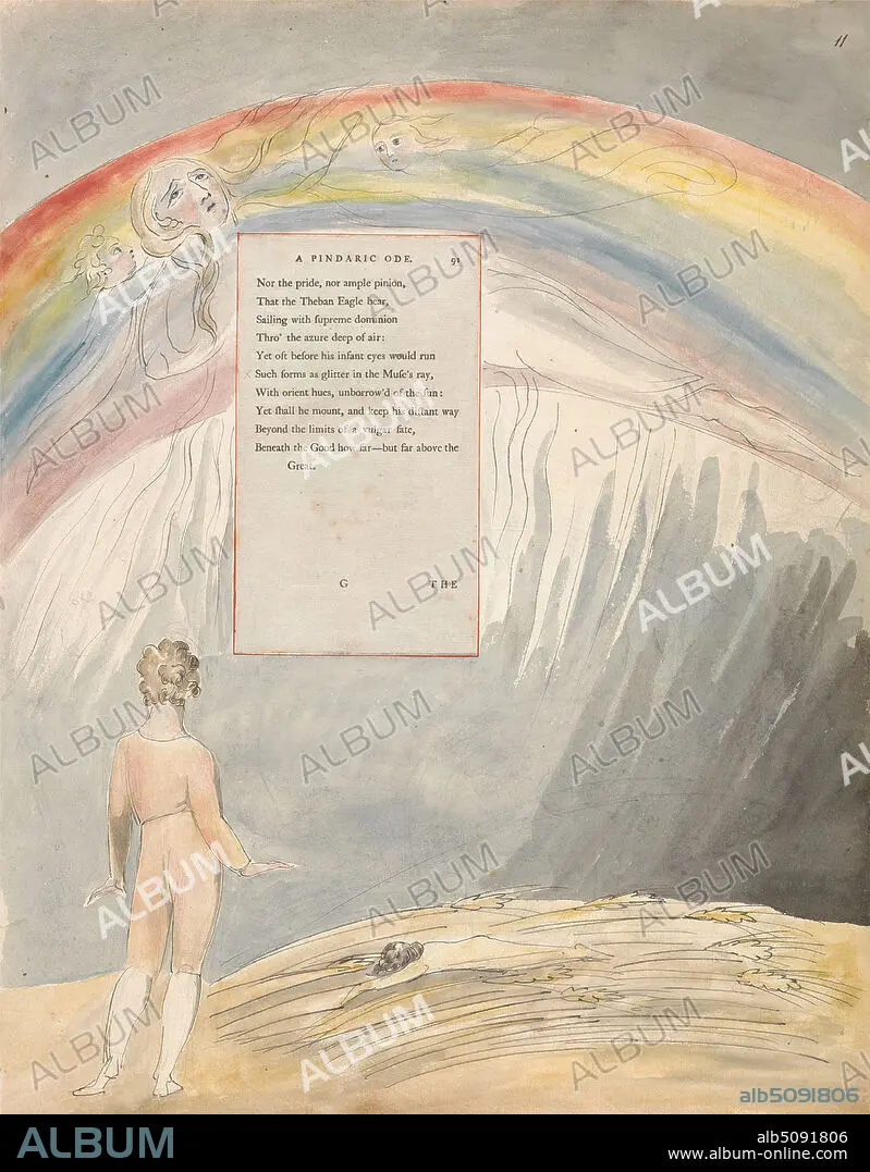 The Poems of Thomas Gray, Design 51, 'The Progress of Poesy.', William Blake, 17571827, British, between 1797 and 1798, Watercolor with pen and black ink and graphite on moderately thick, slightly textured, cream wove paper with inlaid letterpress page, Sheet: 16 1/2 x 12 3/4 inches (41.9 x 32.4 cm), angels, boy, children, literary theme, lyre, men, meteorology, rainbow, religious and mythological subject, science, text, women