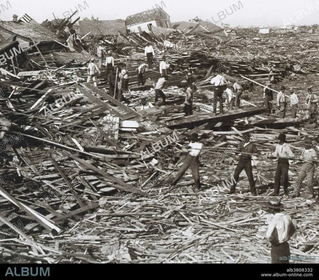 Men use ropes to pull away the debris of houses to look for bodies. The Hurricane of 1900 made landfall on the city of Galveston, Texas, on September 8. It had estimated winds of 145 miles per hour at landfall, making it a Category 4 storm on the Saffir-Simpson Hurricane Scale. It was one of the deadliest and costliest hurricanes in American history. The estimated death toll was between 6,000 and 12,000 individuals. The Galveston Hurricane of 1900 is to date the deadliest natural disaster ever to strike the United States.