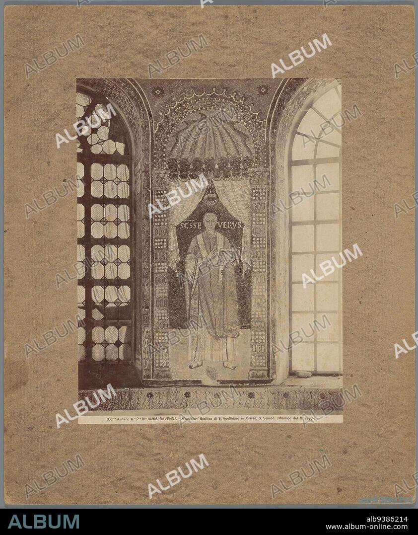 Mosaic in the Basilica of Sant'Apollinare in Classe at Ravenna, depicting Saint Severus, RAVENNA - Emilia. Basilica di S. Apollinare in Classe. S. Severo. (title on object), Alinari (mentioned on object), Basiliek van Sant'Apollinare in Classe, c. 1875 - c. 1900, cardboard, albumen print, height 257 mm × width 195 mm.