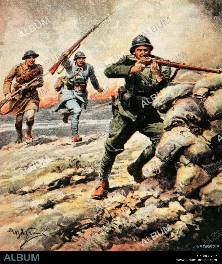 PRIMERA GUERRA MUNDIAL (1914-1918). Llegan los refuerzos de los aliados. Dibujo por A. Beltrame. "La Domenica del Corriere", 1916.