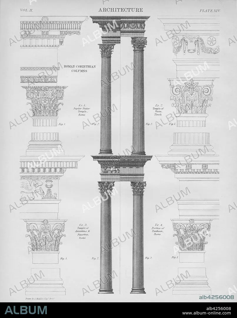 Roman Corinthian columns, 1889. Examples of Corinthian columns from classical buildings in Rome: 1. Jupiter Stator Temple; 2. Temple of Vesta, Tivoli; 3. Temple of Antoninus and Faustina; 4. Portico of the Pantheon. In the Corinthian order, the capitals of the columns are decorated with acanthus leaves. From the 9th edition of the "Encyclopaedia Britannica", 1889.