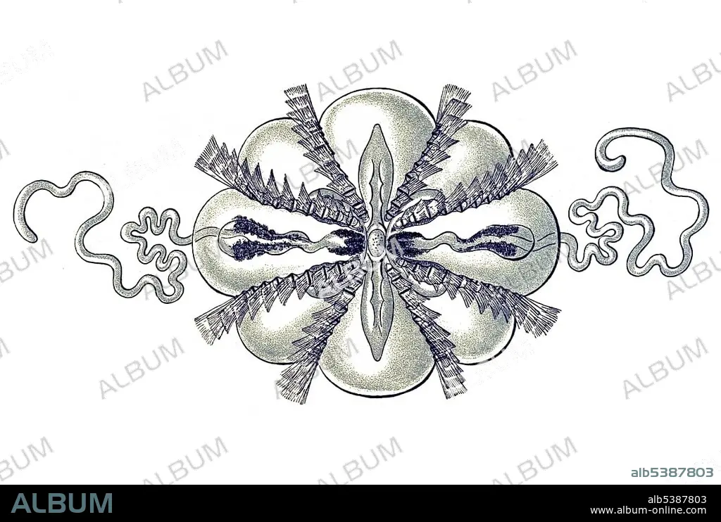 Historic illustration, tablet 27, title Ctenophorae, jellyfish, name Hormiphora, 1/ Haeckelia rubra, Mertensiidae family, view from above, enlarged 8x, Ernst Haeckel, Kunstformen der Natur, "Artforms of Nature"