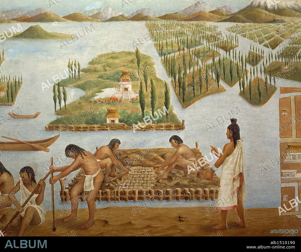 Traducción automática: Manuscrito, México, siglo XVI. Construcción de la ciudad de Tenochtitlan, Aztecas fortaleciendo el terreno con el método de las chinampas. Copia