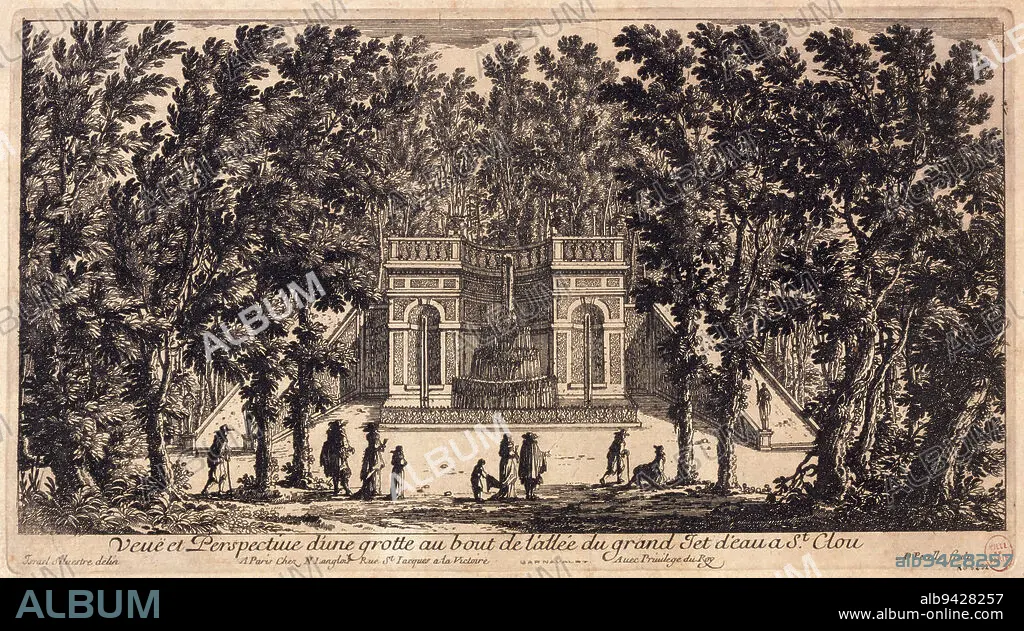 Veuë et Perspective d'une grotte au bout de l'allée du grand Jet d'eau a St. Clou, Pérelle, Adam, Graveur, Silvestre, Israël, Dessinateur, Langlois, Nicolas 1er, Editeur, Vers 1660, 3rd quarter of the 17th century, Graphic arts, Paris, Paris, Paris, Height: 14.3 cm, Width: 25.7 cm.