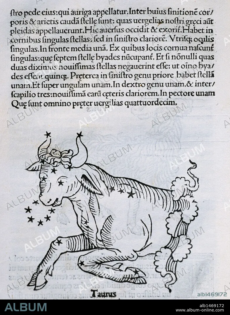 Descripción: "TAURO". Constelación zodiacal. Grabado de la obra "ASTRONOMICON", del escritor hispano-latino Cayo Julio HIGINIO (siglo I d. C.). Editada en Venecia en el año 1485. Incunable.