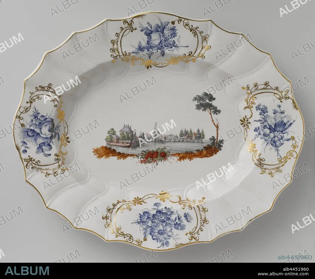Tureen and stand Dish of a tureen with a cityscape and bouquets, Oval dish of a terrine of soft-paste porcelain (pâte tendre) with a scalloped edge, painted on the enamel colors and gold. On the flat a cityscape on Uithoorn. The edge, continuous on the wall, is lightly modeled in three narrow and one wide twisted section. A rocaille cartouche with bouquets in the four broad compartments. Gold border. Marked on the bottom with the stork [?]., Doornik, c. 1778, porcelain (material), soft-paste porcelain, glaze, gold (metal), vitrification