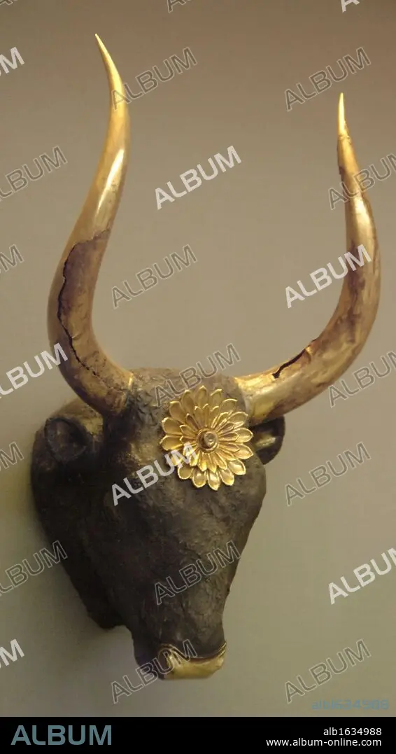 Descripción: ARTE MICENICO. GRECIA. RITON DE PLATA en forma de CABEZA DE TORO con los cuernos de oro y la frente adornada con una roseta de oro. Se cree que los artistas fueron cretenses. Tumba Real IV de Micenas. Fechado en el s. XVI a. C. Museo Arqueológico Nacional. Atenas.