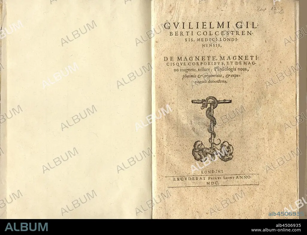 Titelblatt zu William Gilberto ' ... The magnetic magneticisque bodies ...', Title page for William Gilberts '... De magnete, magneticisque corporibus ...' from the 16th century, date estimated:, title page, 1600, William Gilbert: Guilielmi Gilberti Colcestrensis, medici Londinensis, De magnete, magneticisque corporibus, et de magno magnete tellure: physiologia nova, plurimis & argumentis, & experimentis demonstrata. excudebat Petrus Short, 1600