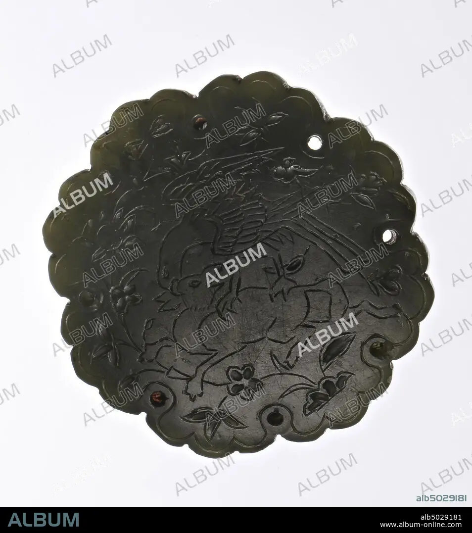 Vz: eagle attacking hare, scene surrounded by flowers and tendrils, gem, intaglio, jade, Color: dark green, Shape: round, flower-shaped, Processing: along edge 8 holes, Method: 48 x 48 mm, D. 6.5 mm, wt. 26.12 gr., Unknown