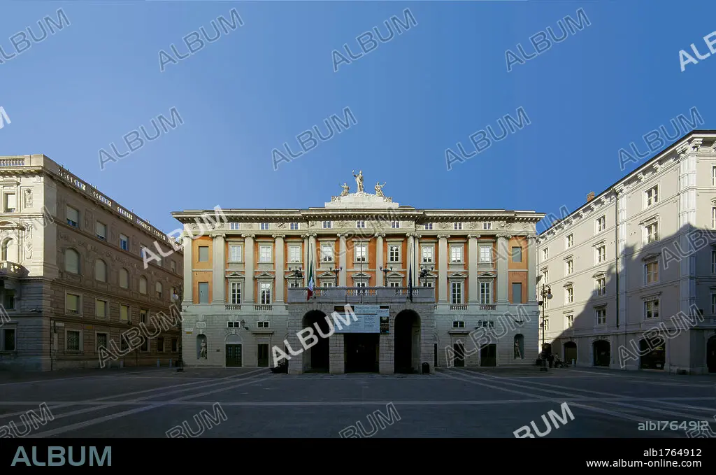 Italy, Friuli Venezia Giulia, Trieste, Giuseppe Verdi Theater. All. View exterior front view facade theater rectangular portico pilasters rustication ashlar work arches monumental architecture half columns Ionic pilaster strips windows rusticated ashlar plinth topping carved facade sculpture square two color effect.