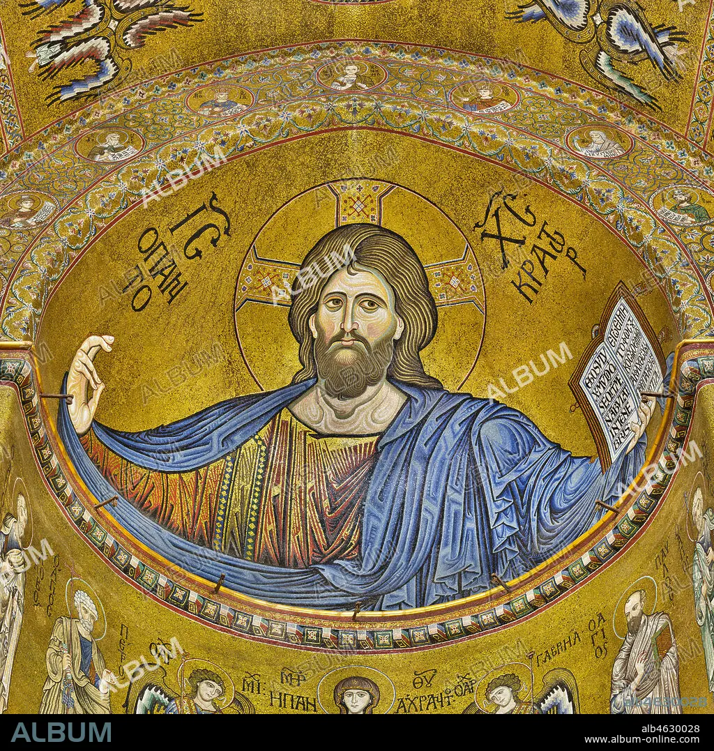 Monreale Cathedral, apse: the Christ Pantocrator; Byzantine mosaic.. Christ is portrayed in a majestic and severe attitude, in the act of blessing with the three fingers of his right hand, according to the use then remained in the Orthodox church.. The mosaics of the Cathedral were made between the twelfth and mid-thirteenth century by partly local and partly Venetian workers, trained at the Byzantine school.