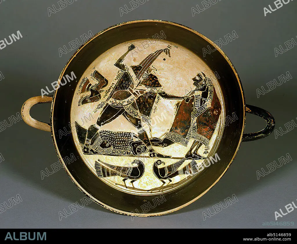 Hunting painter, bowl (Heracles slays Hippokoon and his sons), clay, quickly turned, painted (pottery), alternately fired, clay, Total: Height: 12.4 cm; Width: 24.5 cm; Diameter: 18.6 cm; Base diameter: 8.4 cm, pottery, Greek heroes, middle archaic, The interior of the laconic bowl assembled from a few shards shows a battle scene. In the left half of the picture there is a large male figure striding to the right. The man is dressed in a short, belted chiton, a cloak, greaves and sandals; a sword hangs at his side. Long curly strands fall down to the chest and back. From the formerly probably colored face only one eye and the beard are preserved. In the raised right hand the forward bent figure holds a spear. With her left hand she reaches for the one in front of him of the two fleeing enemies, who are dressed in coats and look around. At the feet of the man lie two other figures, also clothed in coats. An eagle flies behind them. Below the ground line two birds stand antithetically, turning their heads back. The interpretation of this scene is difficult, so Hans Jucker has suggested that the main character should be the Cretan giant Talos, who kills intruders. Erika Simon wanted to recognize Aigisthos, who kills his classmates. Michael Maaß and Conrad M. Stibbe referred to the myth about the Spartan king Tyndareos: Hippocoon had driven Tynadreos out of Sparta. However, he was able to return after Heracles had slain Hippocoon and his sons. In Laconia an independent high-quality ceramic developed around 580 BC, which was initially oriented towards Athens. Characteristic features are the orange, finely clay and a yellowish-cream colored coating. The guiding form is the bowl. Laconic vases are widespread, pieces are known from Marseille, Taranto, Naukratis, Sardes, Rhodes, Samos and also Etruria as well as from mainland Greece.