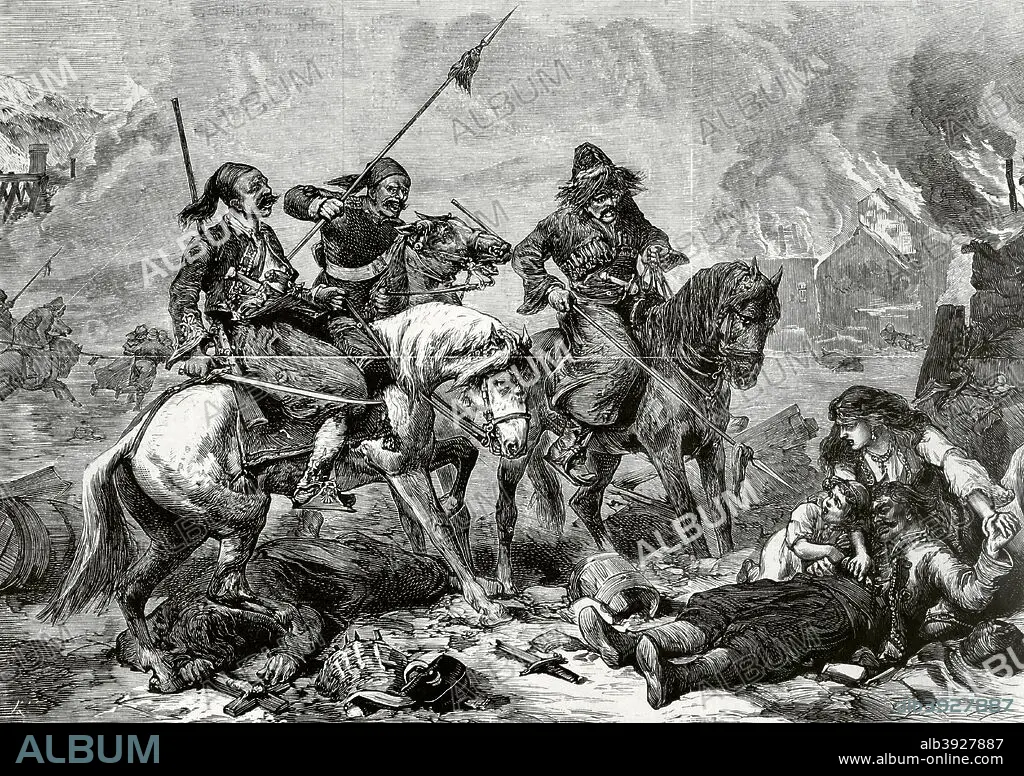 Europa. Siglo XIX. La Cuestión de Oriente. Guerra Turco-Serbia (1876-1878). El debilitamiento del Imperio Otomano hace nacer movimientos nacionalistas en los Balcanes. Serbia declaró la guerra al Imperio Otomano el 30 de junio de 1876. En Bulgaria se vivió el levantamiento de abril de 1876 con una fuerte represión por parte de las autoridades turcas. Los Bashi-Bazouks (soldados irregulares del ejército otomano) incendiando una aldeacristiana búlgara y acuchillando a sus habitantes. Estos soldados mercenarios eran conocidos por sus saqueos y salvajismo. Se hicieron famosos por atacar a la población civil. Grabado. La Ilustración Española y Americana, 30 de agosto de 1876. Biblioteca Histórico Militar de Barcelona. Cataluña, España.