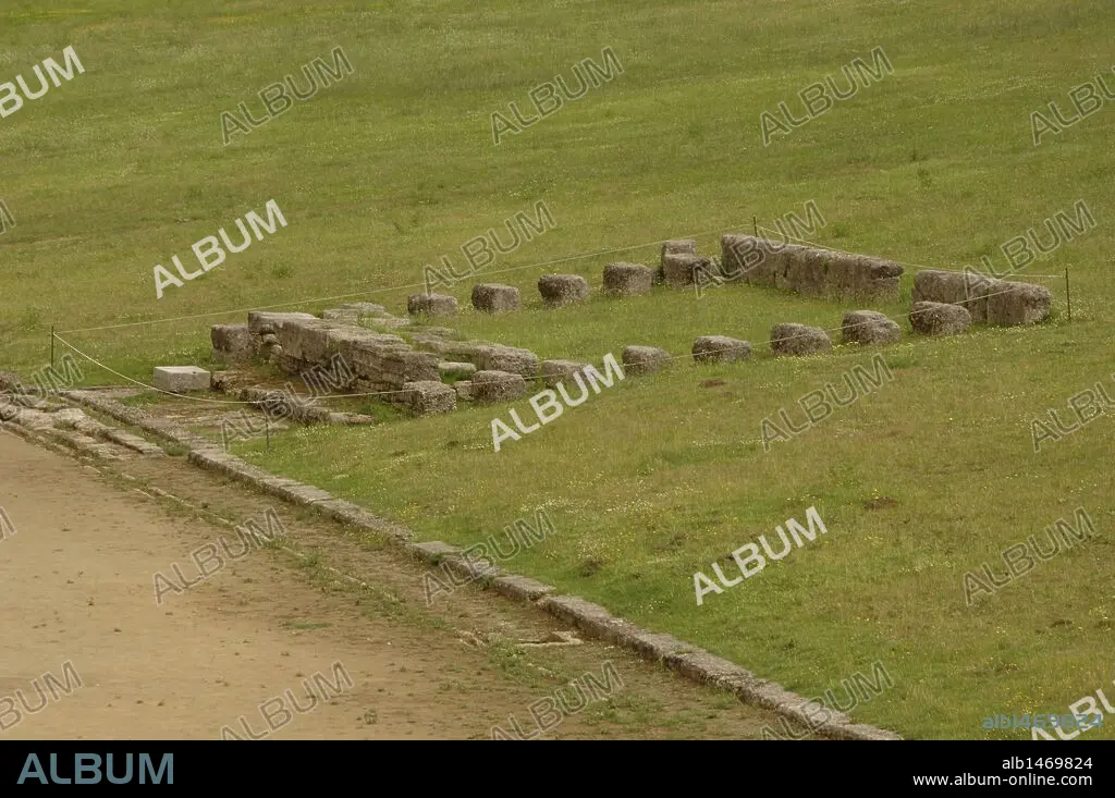 ARTE GRIEGO. GRECIA. ESTADIO DE OLIMPIA. Vista parcial de las ruinas del estadio en el que se celebraban los juegos olímpicos. Este nunca tuvo graderíos, únicamente una tribuna para los jueces en el lado derecho. OLIMPIA. Provincia de Ilia. Región Peloponeso.