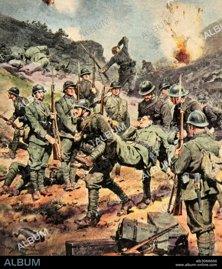 PRIMERA GUERRA MUNDIAL (1914-1918). La muerte de un coronel italiano. Dibujo por Achille de Beltrame (1871-1945). "La Domenica del Corriere",1916.