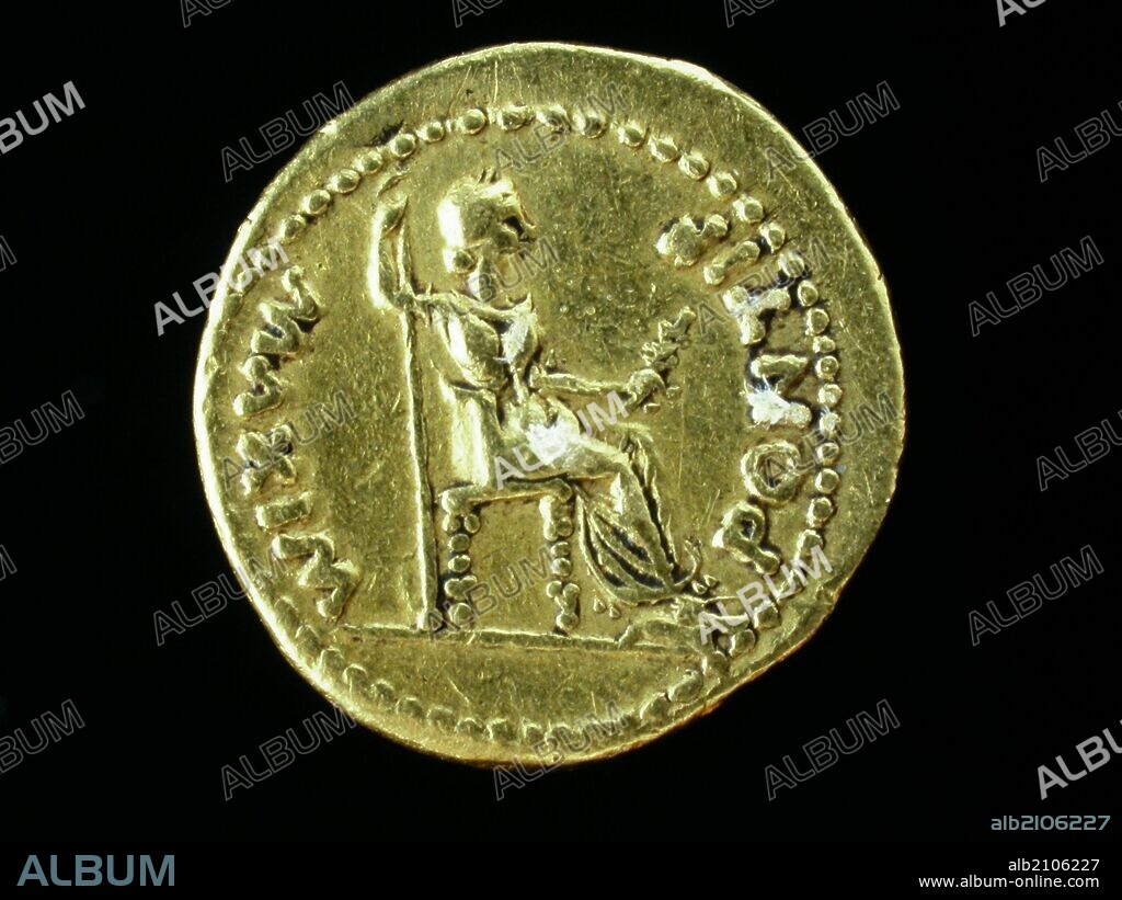 NUMISMATICA. MONEDA IMPERIO ROMANO. AUREO DE ORO, DE TIBERIO. REVERSO. LIVIA O PAX SENTADA A LA DERECHA,LLEVA EN LA MANO IZQUIERDA UNA RAMITA. 14-21 D.C. (DEPOSITO: MUSEO ARQUEOLOGICO NACIONAL).
