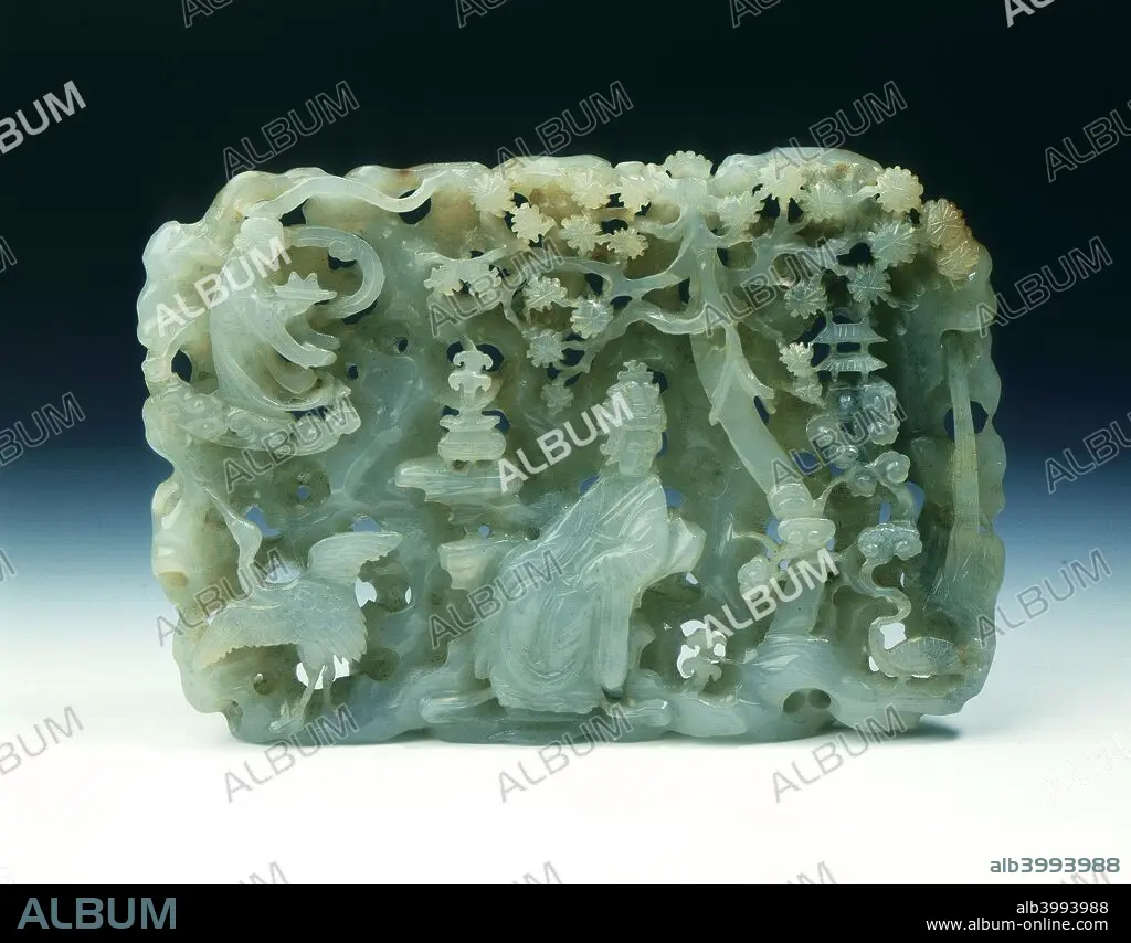 Jade reticulated plaque of Daoist paradise, late Ming or early Qing dynasty, China, 17th century. A reticulated roughly rectangular plaque of a Daoist paradise showing Xi Wangmu (Queen Mother of the West) seated under a pine tree with a crane and incense burner by her side. On the other side of the pine tree is a tortoise belching clouds on which a pagoda floats. A fairy riding a cloud vehicle is in the sky above and to one side. The whole scene is set against a backdrop of perforated rocks.