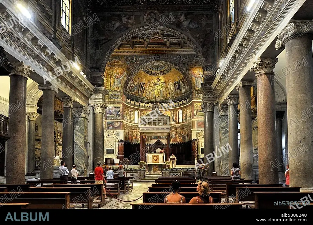 Nave with antique Ionic columns, triumphal arch, altar with marble ciborium or canopy and apse during mass, Basilica Santa Maria in Trastevere, Rome, Lazio, Italy, Europe.
