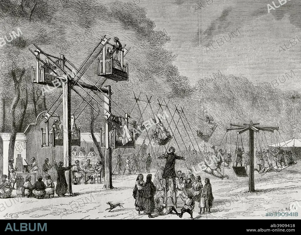 Descripción: Norte de Africa. Egipto. Festividades en Alejandría. Regocijos populares durante las fiestas religiosa del gran Bayram (Fiesta del Sacrificio). La celebración incluye compartir alimentos con famiiares y con personas pobres, sacrificar un animal, vestir ropa nueva, regalos para niños, diversiones en una feria, visitar las tumbas de familiares, etc. Dibujo por Ricardo Balaca (1844-1880). Grabado. La Ilustración Española y Americana, 30 de mayo de 1876. Biblioteca Histórico Militar de Barcelona. Cataluña, España.