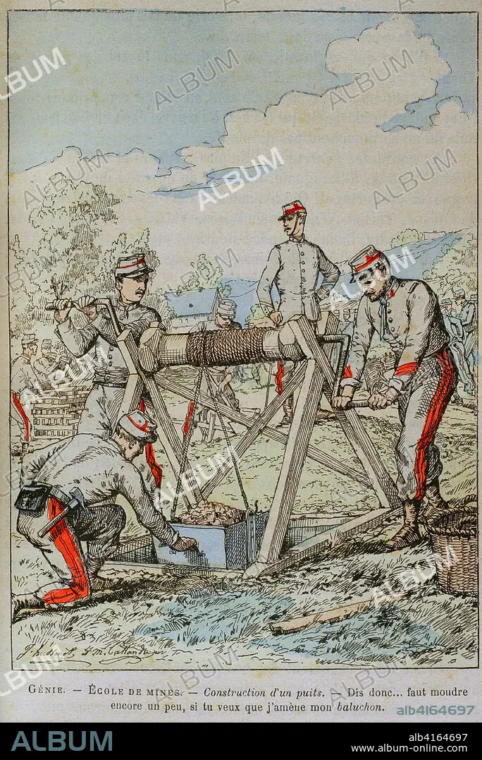 Ejército francés. Ingeniero. Escuela de Minas. Construcción de un pozo. Ilustración a color de la "Armeé Française, Nos Soldats" (Ejército Francés, Nuestros Soldados). Autor, Eugene Hennebert (1826-1896). París, h. 1890. Ilustraciones firmadas por Hussenot y Pallandre. Biblioteca Histórico Militar de Barcelona, Cataluña, España.