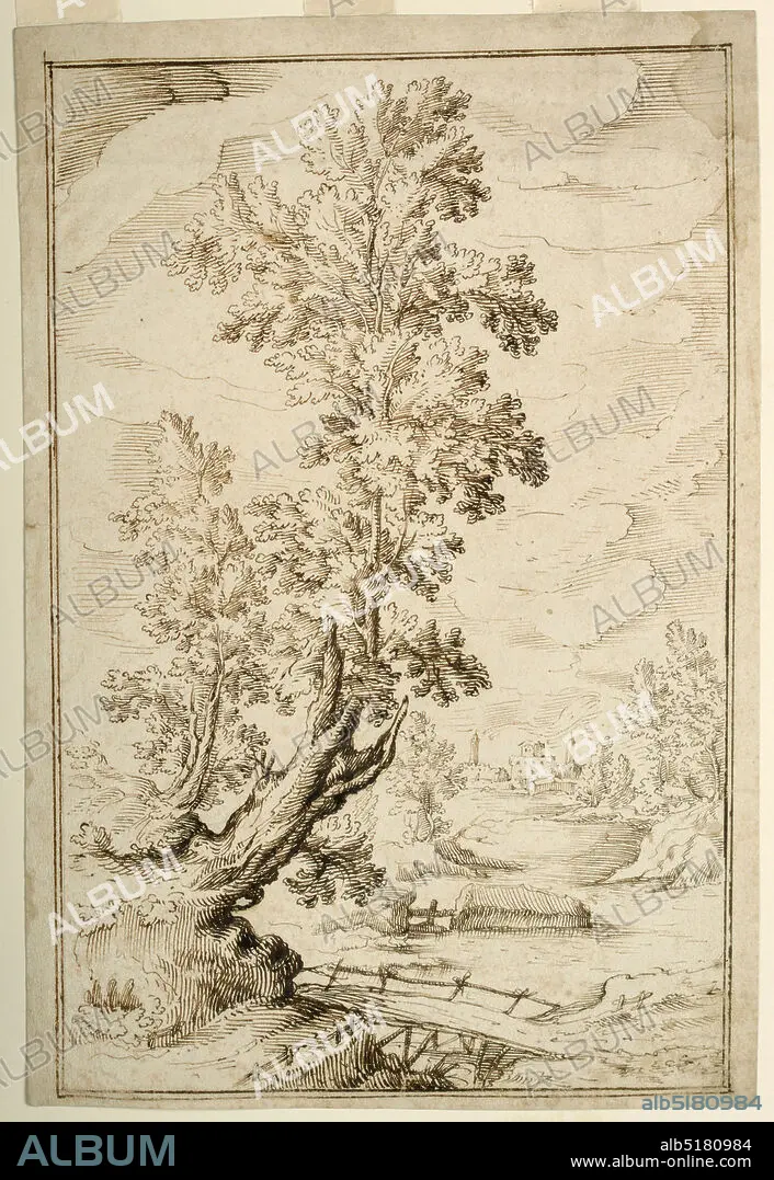 Landscape with Tree beside a Stream, Girolamo Mattioli, Italian, Pen and ink on paper, A stream winds through the countryside. In the foreground a group of trees, a road and a bridge across the stream. In the background, a town and mountain., Italy, late 16th century, landscapes, Drawing, Drawing.