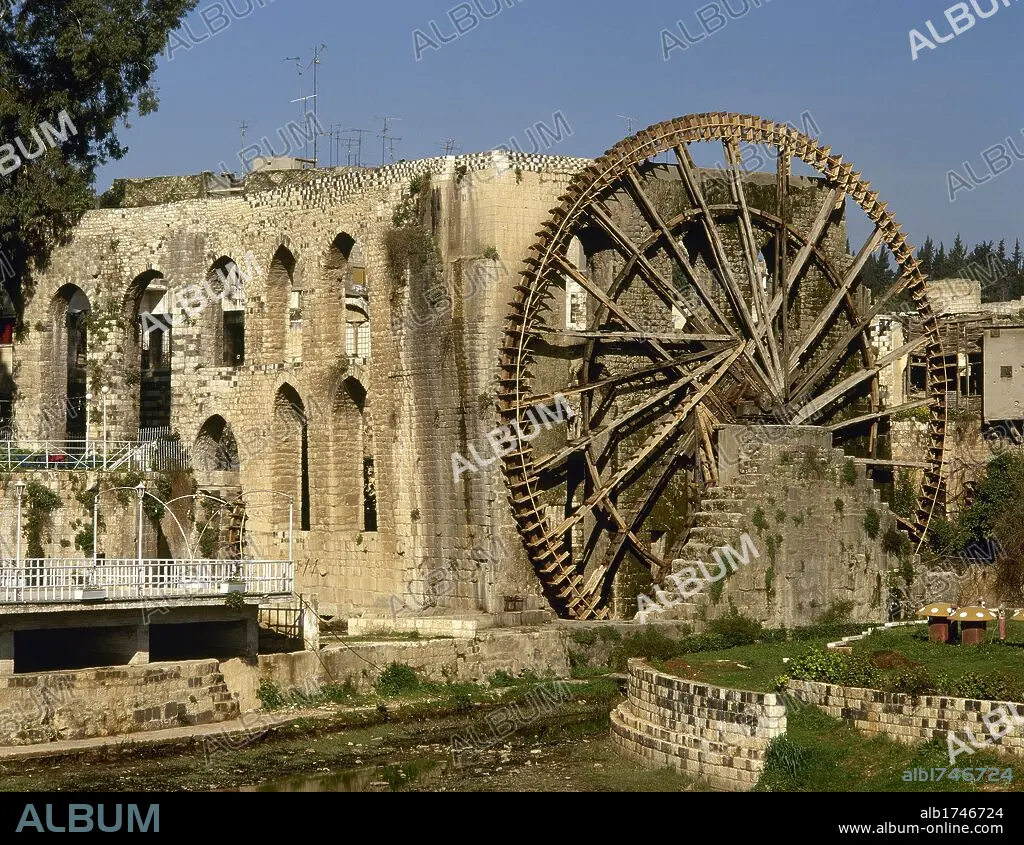 Descripción: SIRIA. HAMA. Vista general de la NORIA medieval ubicada en uno de los jardines del centro de la ciudad, junto a la ribera del río Orontes. Junto a ella, el ACUEDUCTO, sustentado por elegantes arcadas de piedra, que hacía llegar el agua a las mezquitas y edificios públicos aledaños.