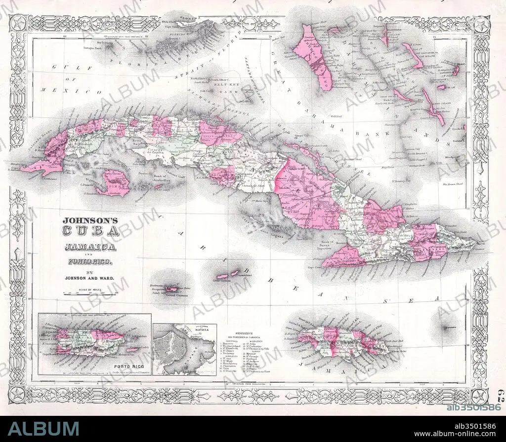 1864, Johnson's Map of Cuba, Jamaica, the Bahamas and Puerto Rico.