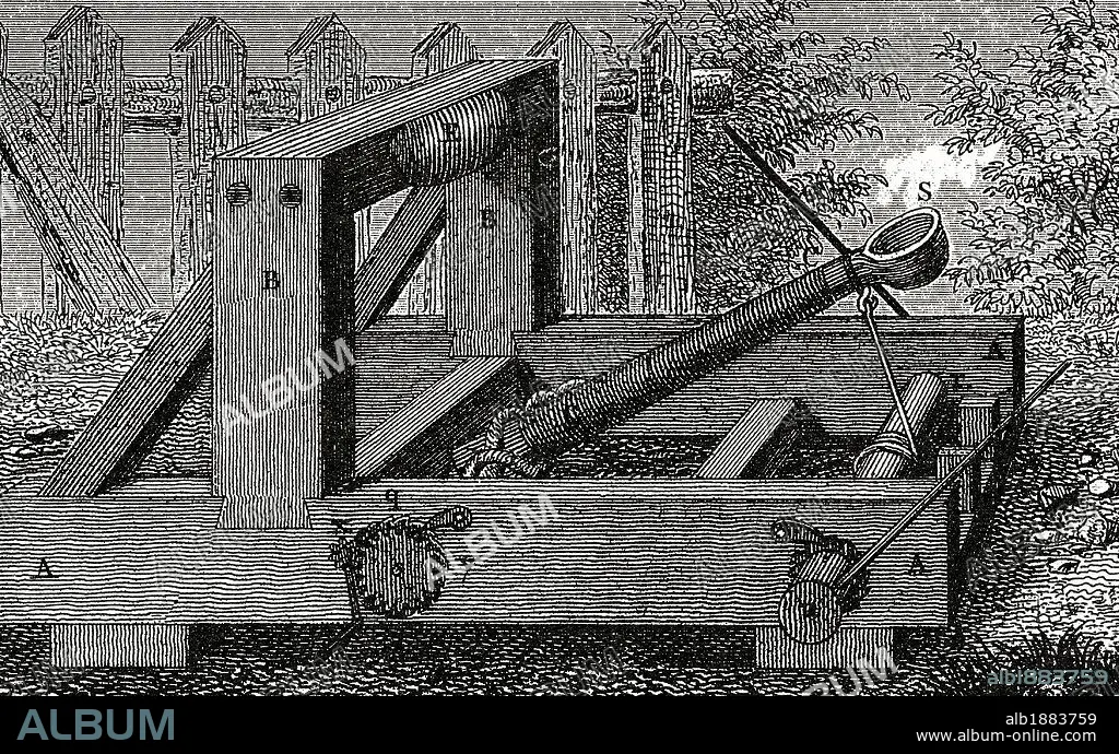 IMPERIO ROMANO. EJERCITO. CATAPULTA utilizada por las tropas romanas durante sus campañas militares. Grabado del siglo XIX.